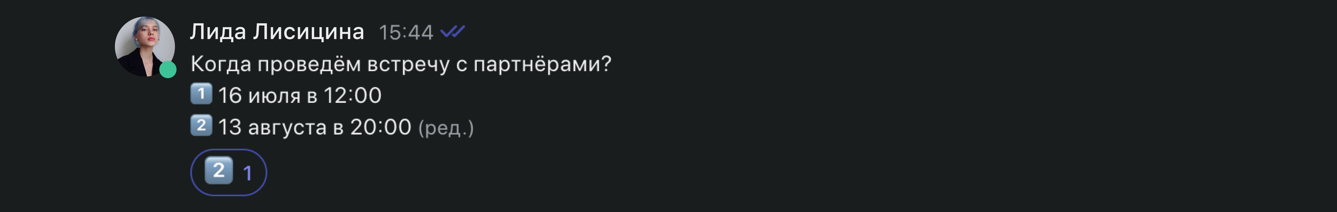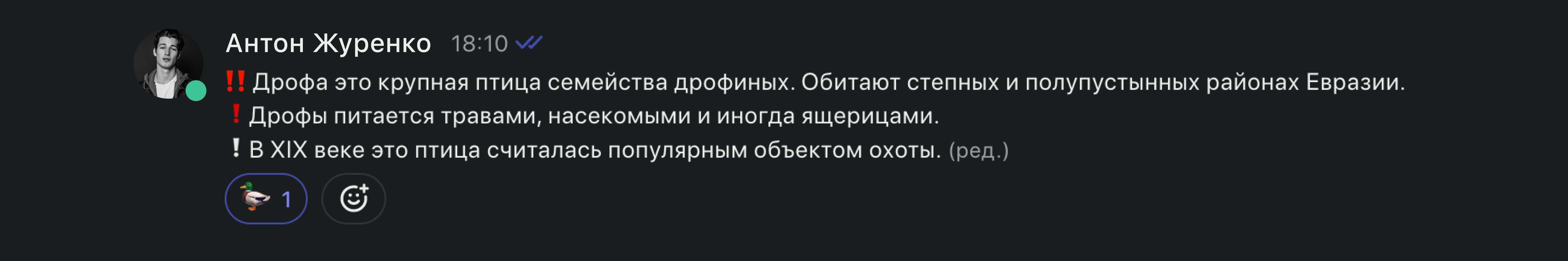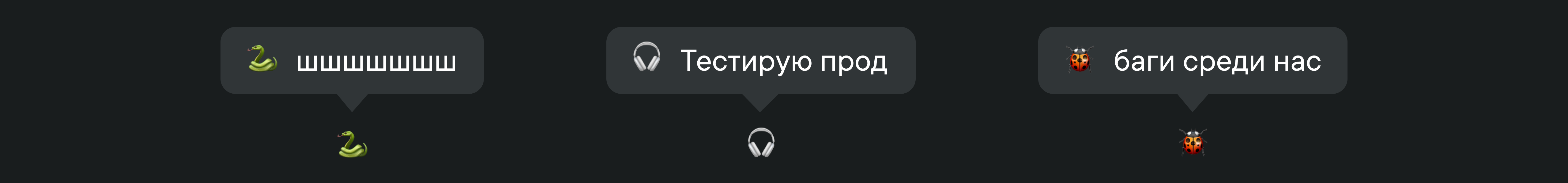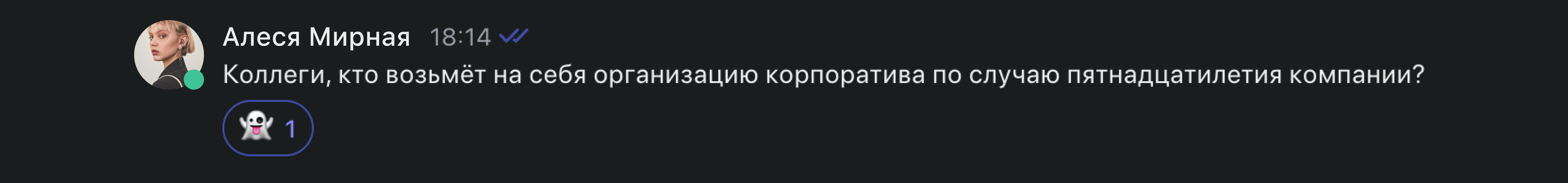 Можно и назначить каждой команде/сотруднику по эмоджи. И, например, к сообщению «Коллеги, кто возьмётся за отчёт?», команда 👯♀️ или сотрудник 👻 поставит свой эмоджи, и все будут знать, кто занят этой задачей.