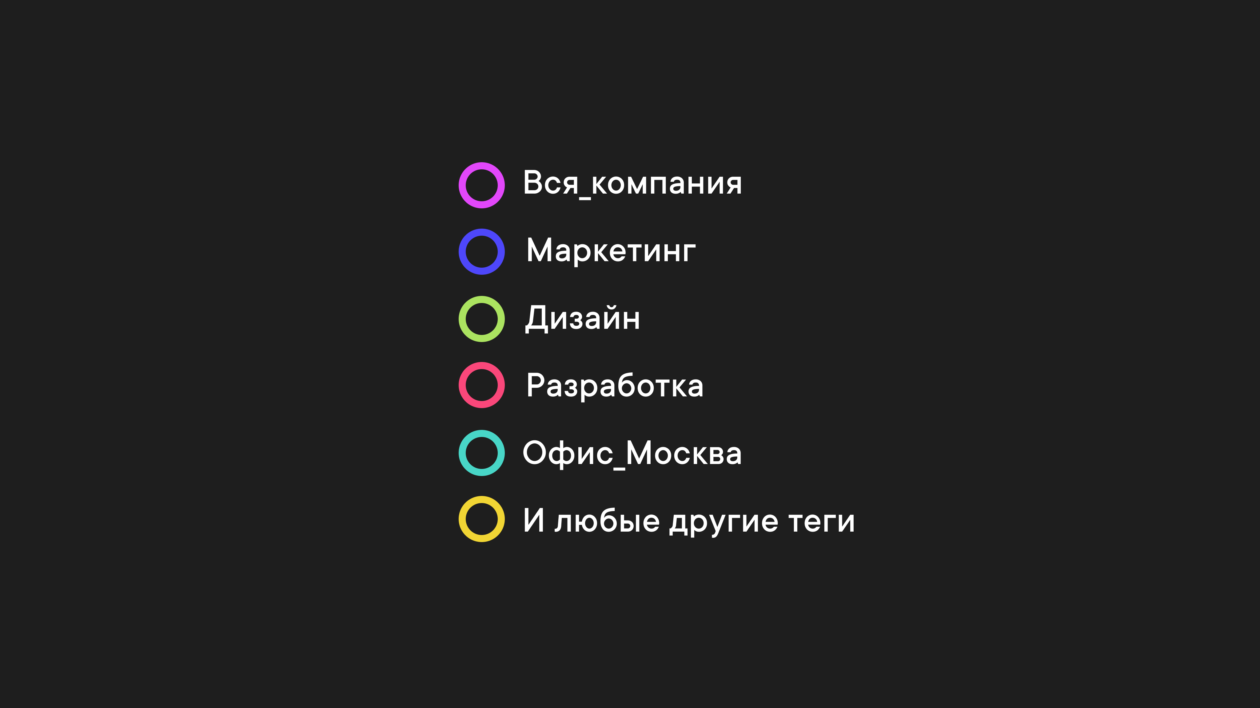 Через теги можно быстро добавлять много сотрудников в чаты в пару кликов. Нужно просто добавить тег в чат и к нему присоединятся все нужные пользователи. Также, если в команду придет новый сотрудник, то его можно быстро добавить во все необходимые чаты — для этого достаточно присвоить пользователю теги и он автоматически попадет туда, куда нужно. Подробнее о тегах можно почитать в этой статье.