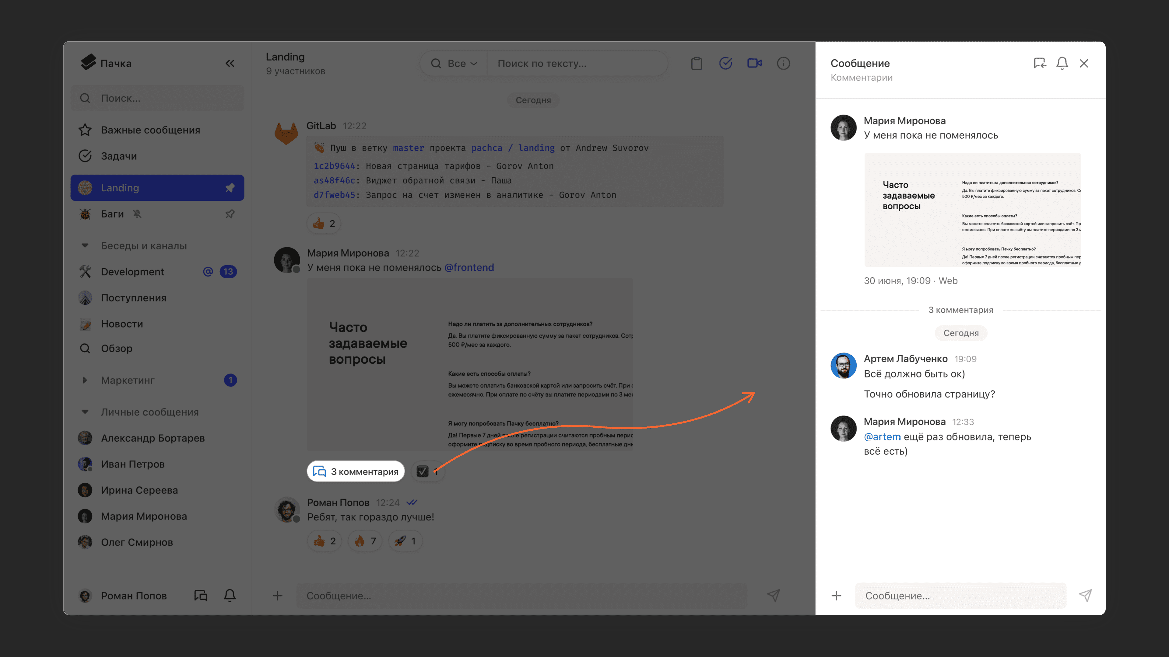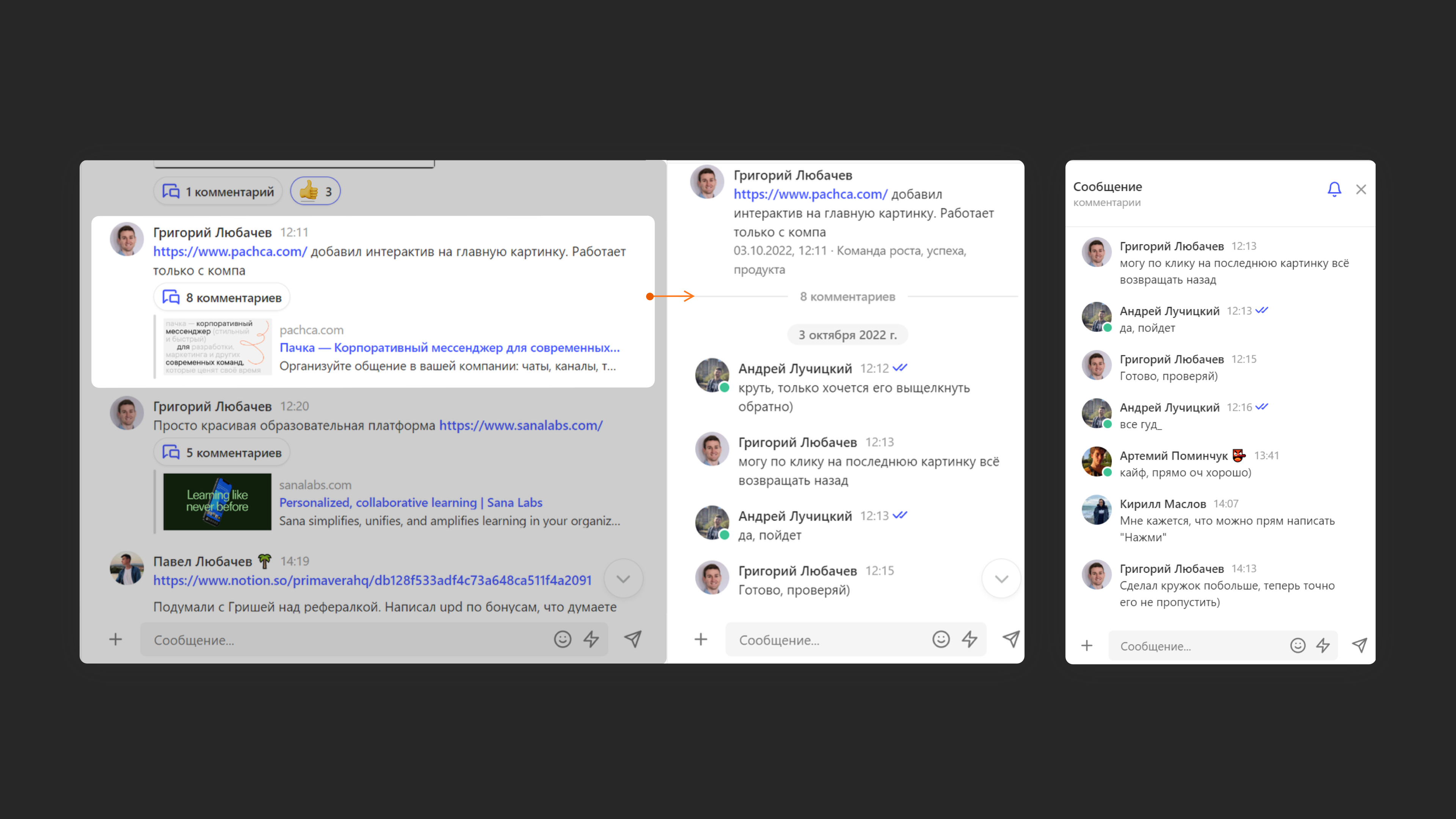 Но мы бы не выделяли возможность оставить комментарий в отдельную статью, если бы это не могло принести пользу для вас. Треды — ключевое отличие Пачки от Telegram и WhatsApp, которое меняет процесс общения на работе. Давайте разбираться почему.