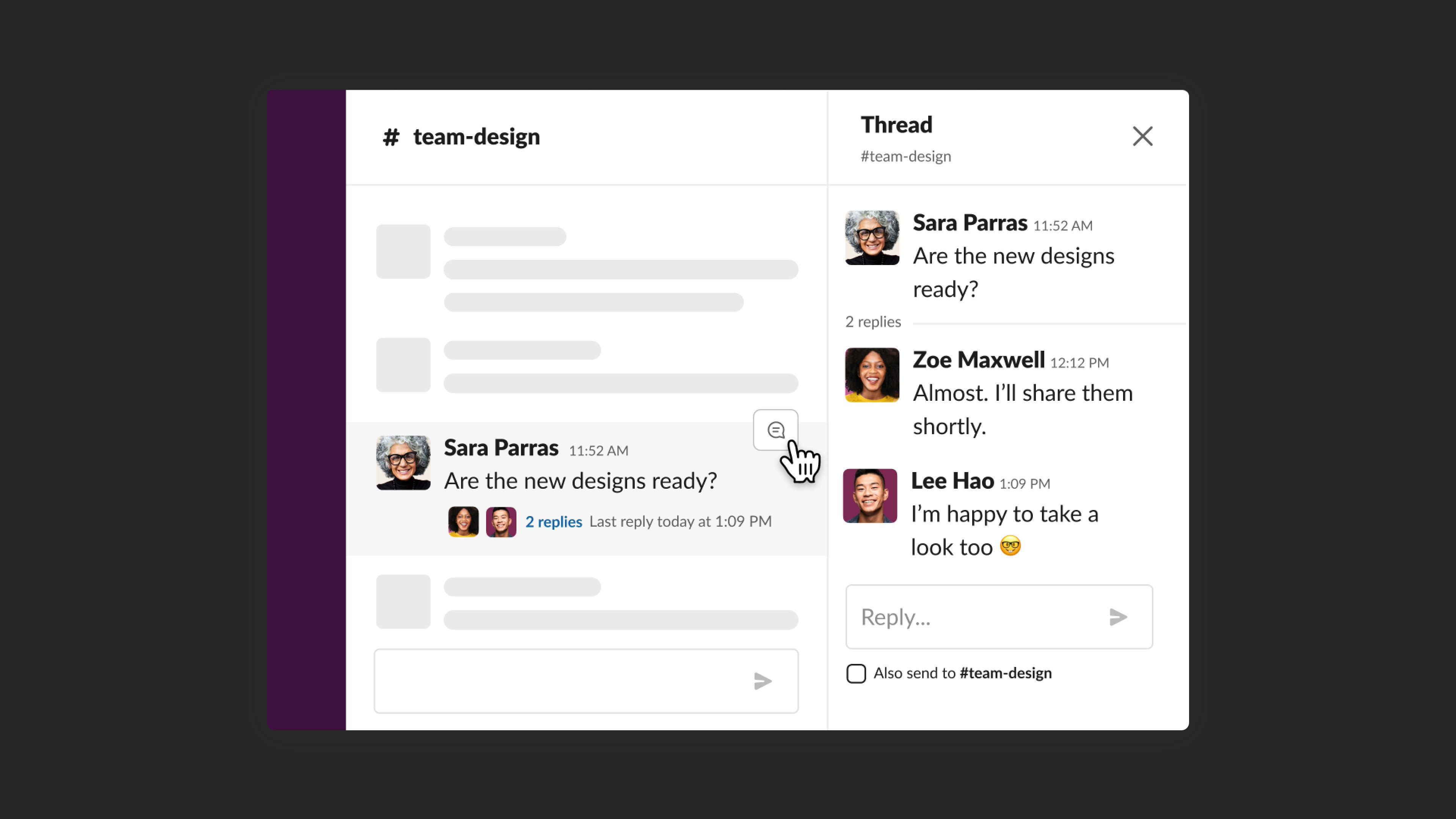 Примечание: Slack переводит “Threads” как обсуждения. Это отражает суть функционала: команда может перекинуться сообщениями и обсудить вопрос (а не просто оставить комментарий)