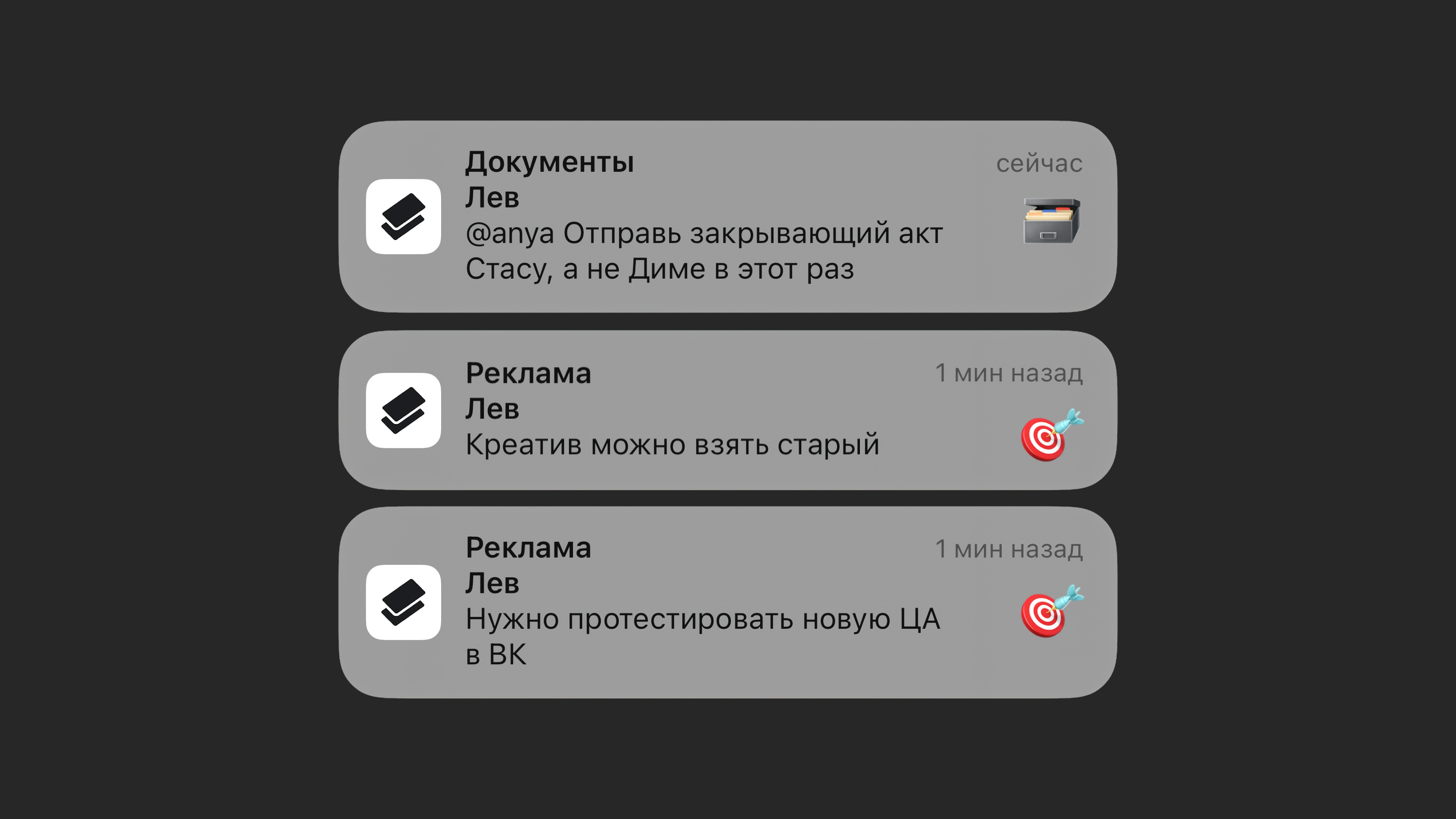 - Напоминания на сегодня, где я ответственный — пуш приходит рано утром, ближе к 9-и часам