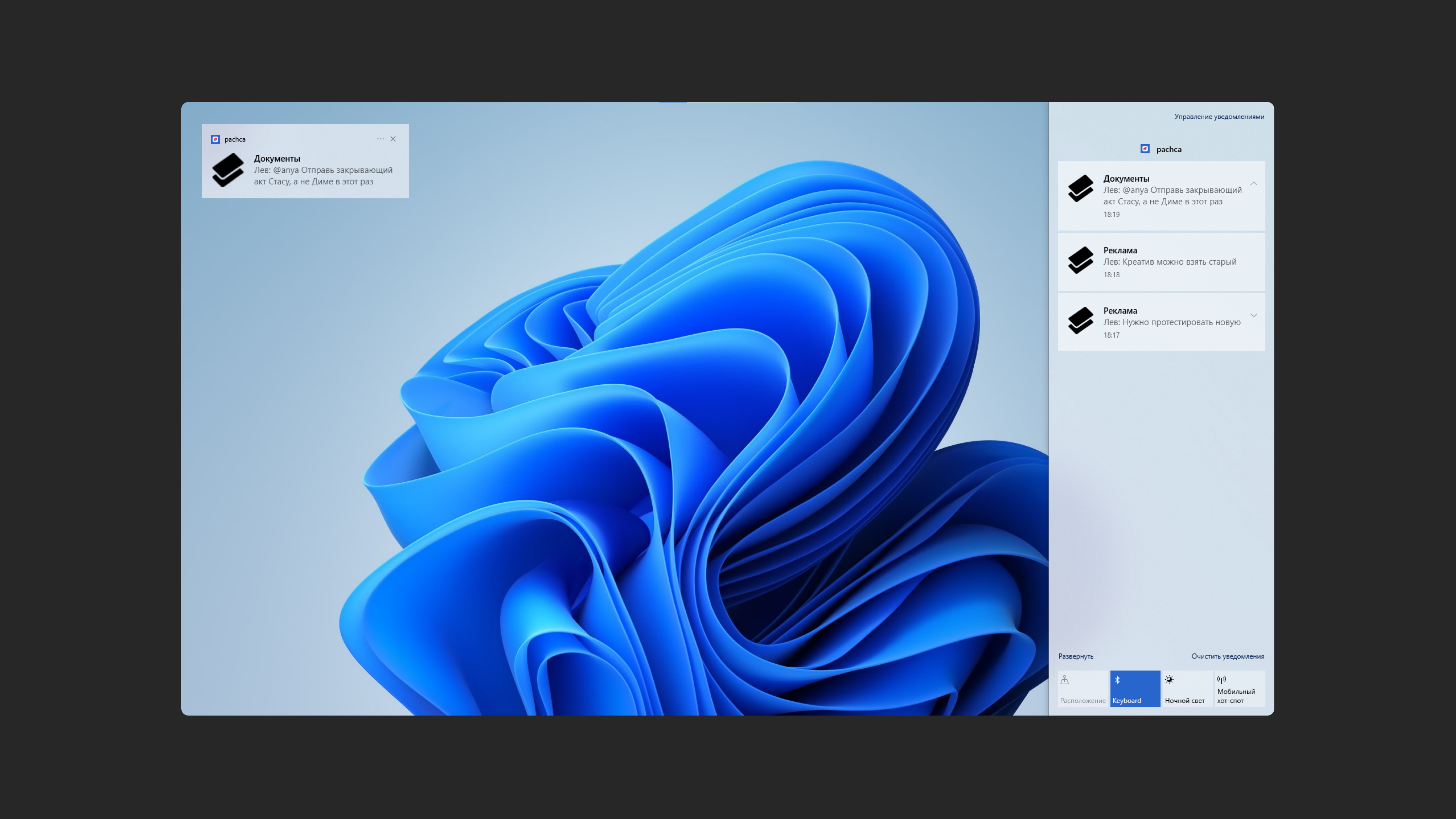 При получении новых сообщений во время работы в десктопном приложении Пачки — вы будете получать системные уведомления о них.