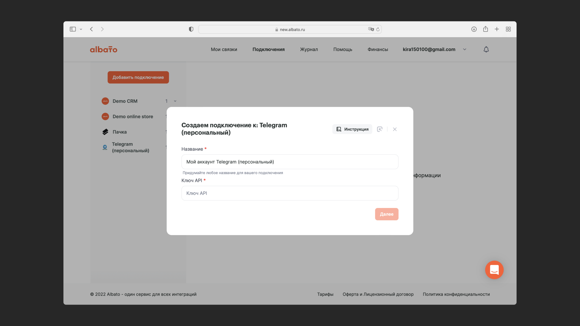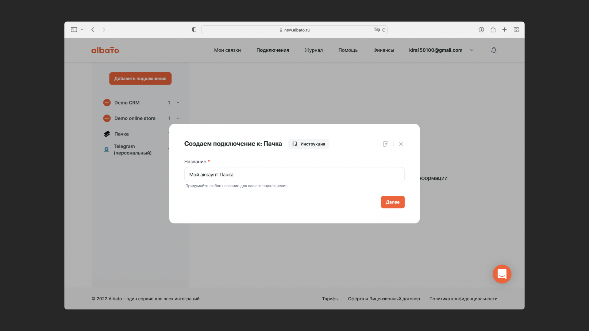 - Вернитесь на сайт Albato и в личном кабинете откройте раздел «Подключения»