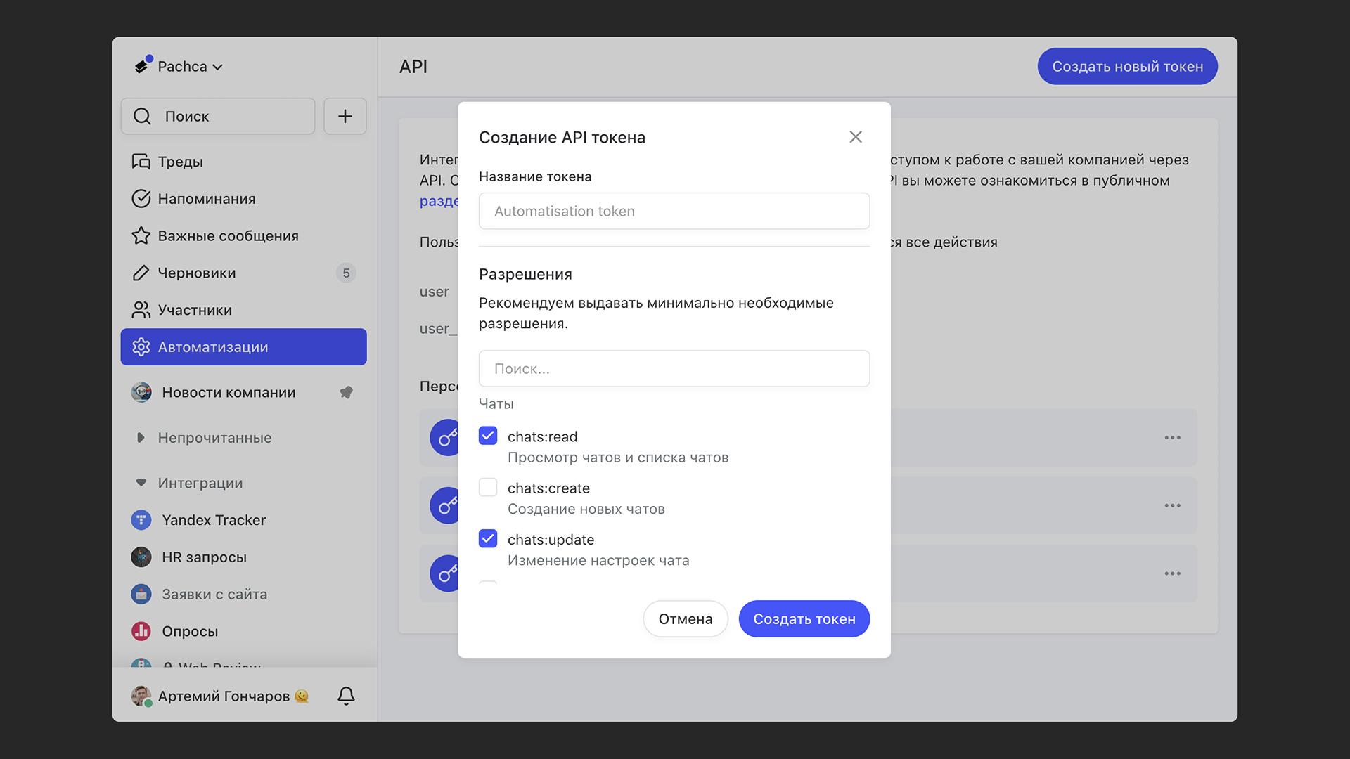 Сейчас в списке разрешений можно выдать доступы на те же действия, что есть в нашем публичном API. Также в интерфейсе создания новых токенов также будет указано, когда они были созданы и использовались ли — это позволит поддерживать актуальность интеграций и предоставленных доступов для токенов.