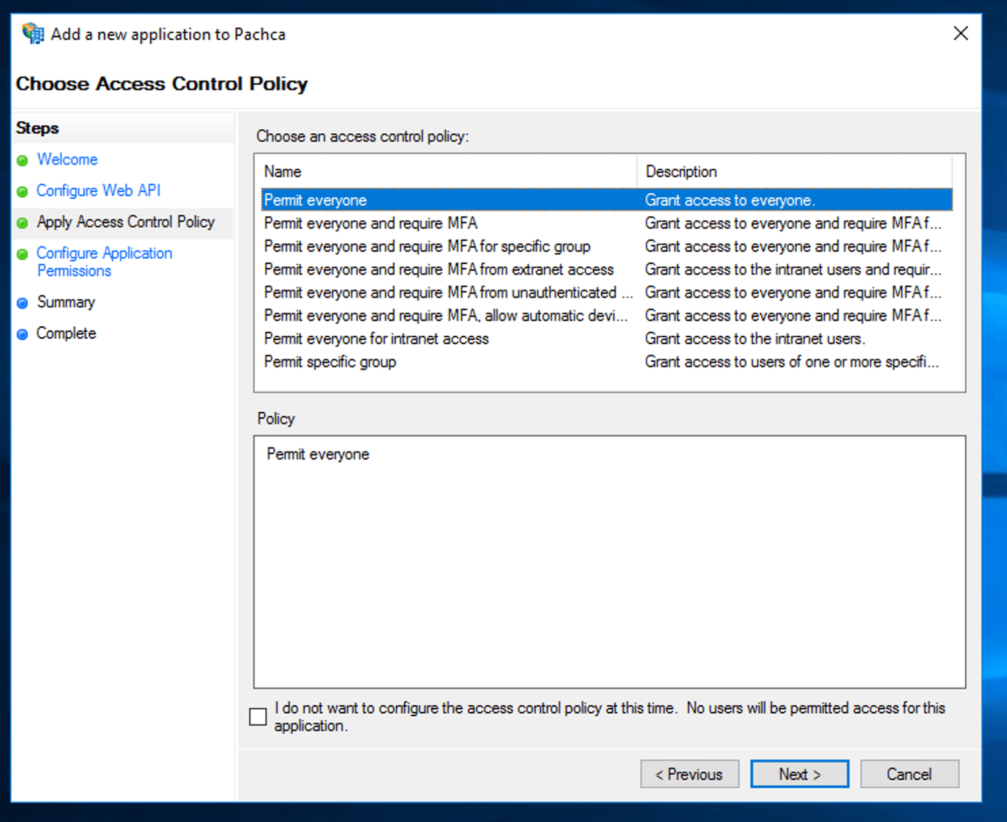 «Access Control Policy» оставьте выбранным «Permit everyone» за исключением ситуации, когда вам потребуется более тонкая настройка прав по работе ваших пользователей с приложением аутентификации.