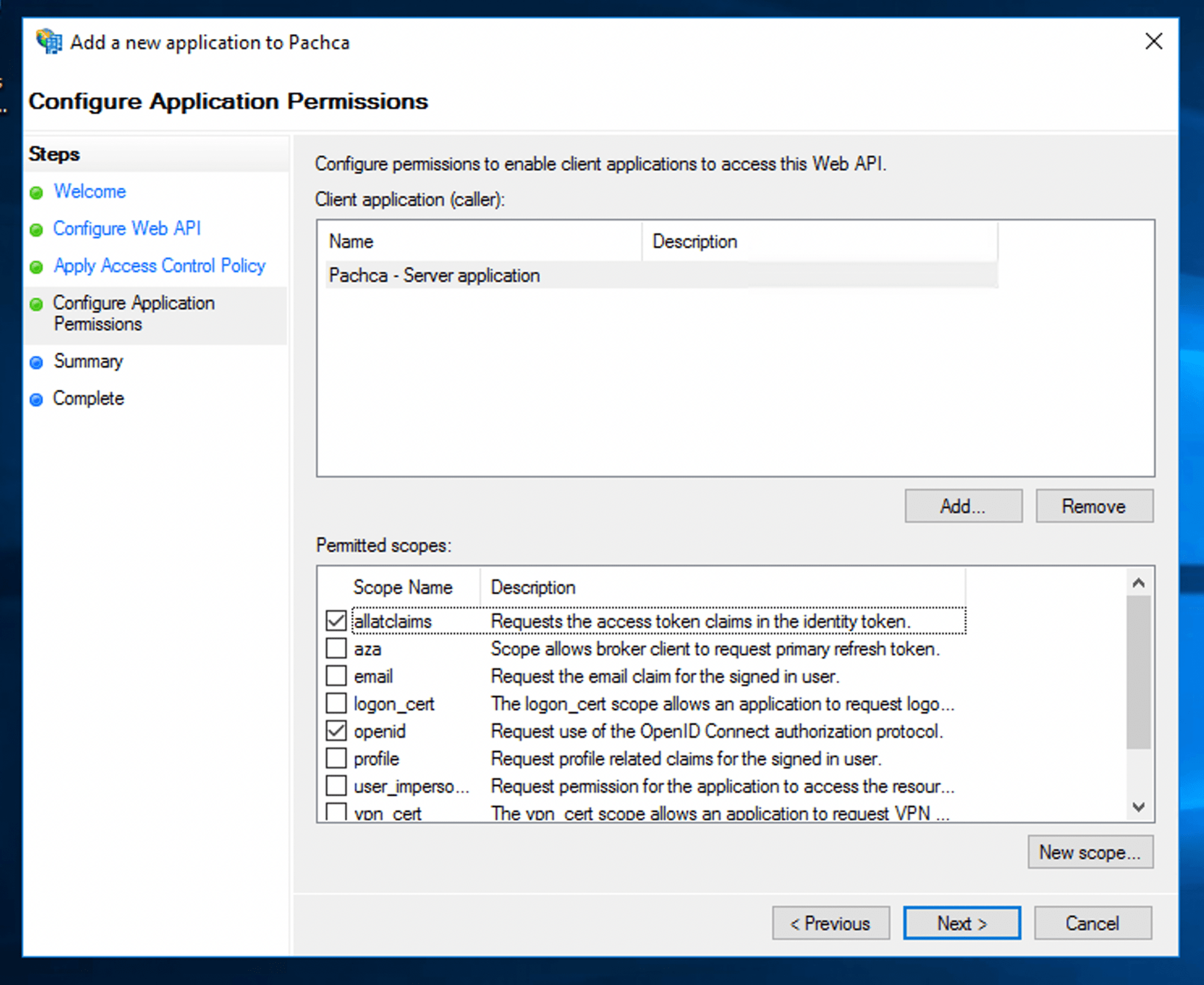 В разделе «Permitted scopes» выберите «allatclaims» и «openid».