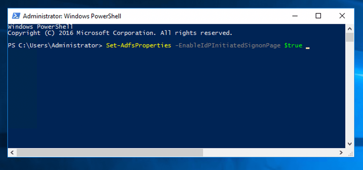 Для включения возможности авторизации через Identity Provider необходимо выполнить PowerShell команду:
