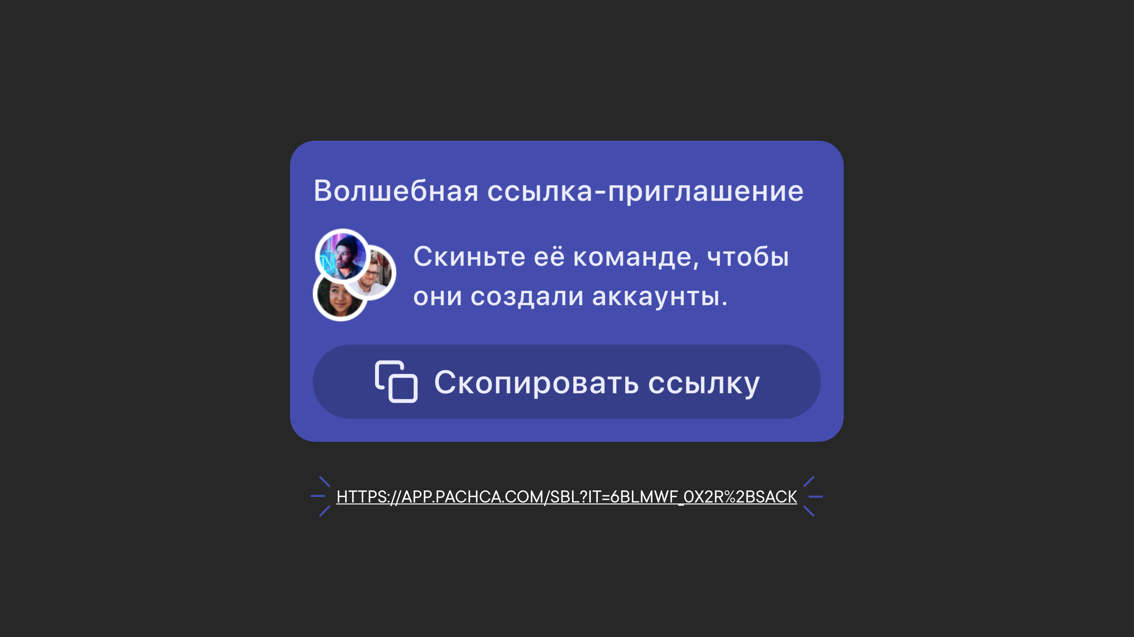 Вам пришла ссылка на регистрацию в Пачке. После перехода по ссылке нужно ввести свою почту (нужна для входа в Пачку), затем код, который мы на неё пришлём, и ваше «Имя». Вы сразу попадёте в пространство вашей компании в Пачке.