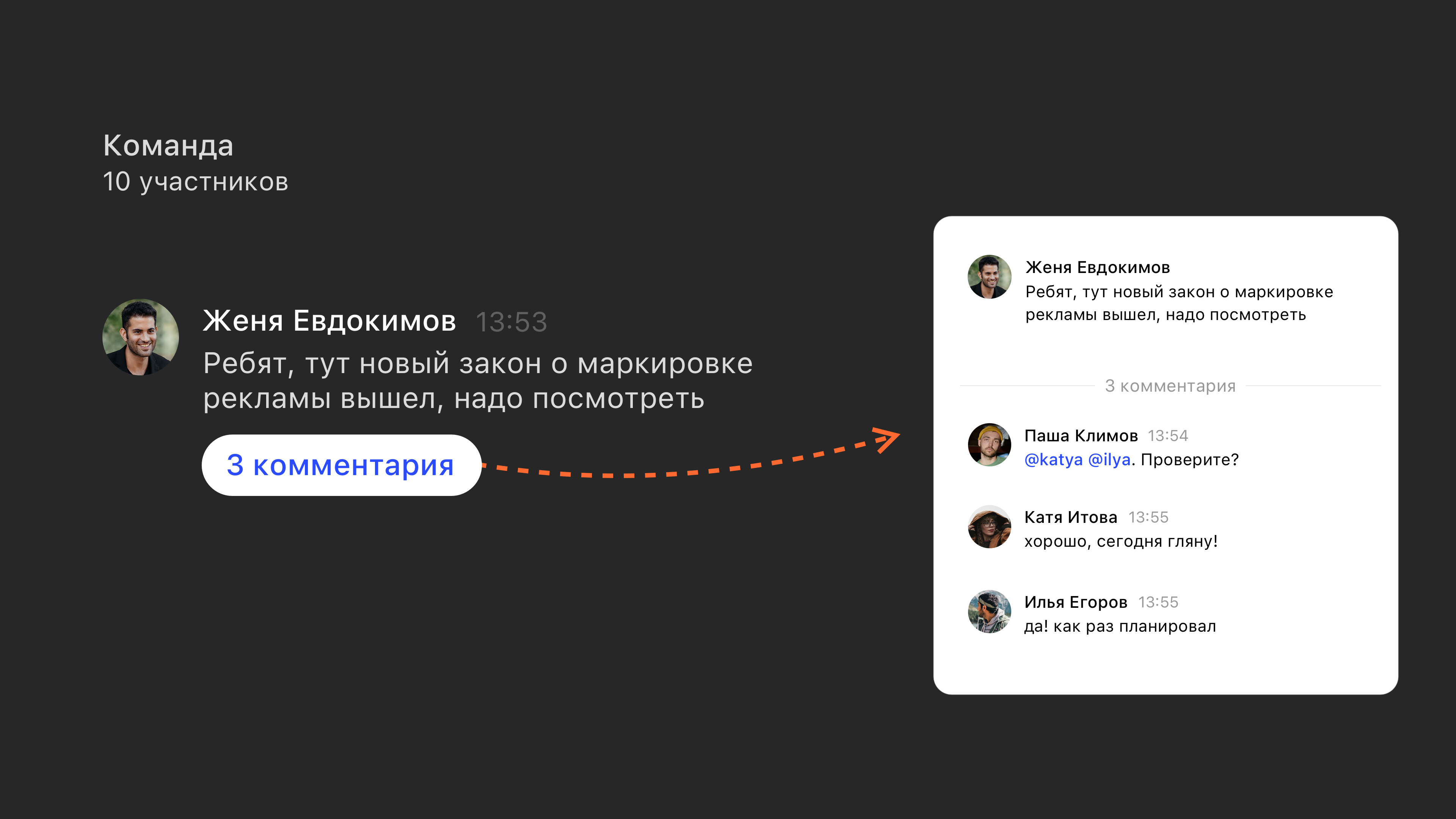 Сквозной тред позволяет общаться с коллегами напрямую и снимает необходимость в лишних чатах и пересылках сообщений туда-обратно.