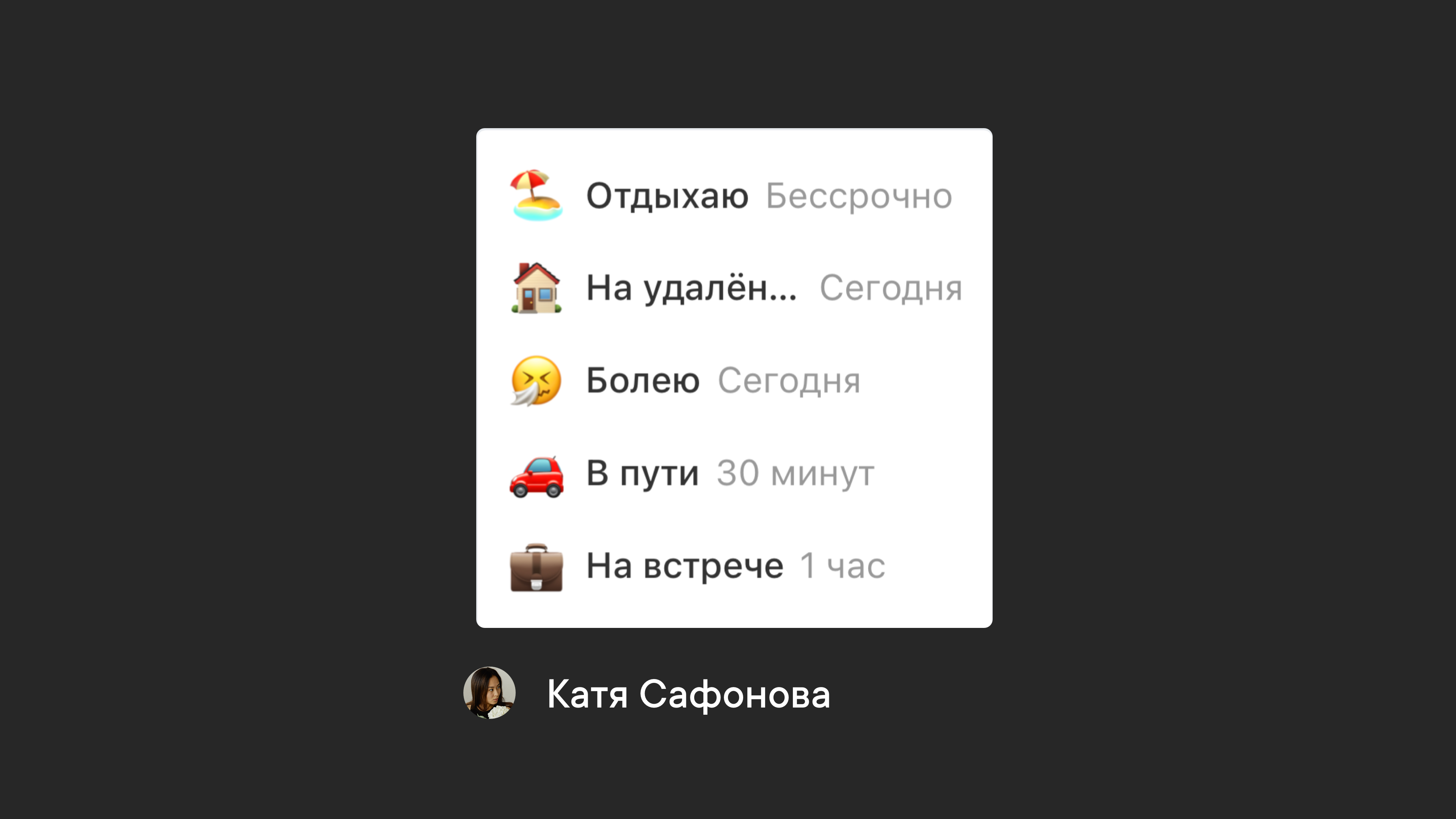 Коллегам всегда видно статусы онлайн или оффлайн, но иногда этого недостаточно. Вы можете сообщить коллегам об отпуске, встрече или больничном, не отвлекая их сообщениями в чатах. Можно выбрать один из стандартных статусов в Пачке или создать свой.