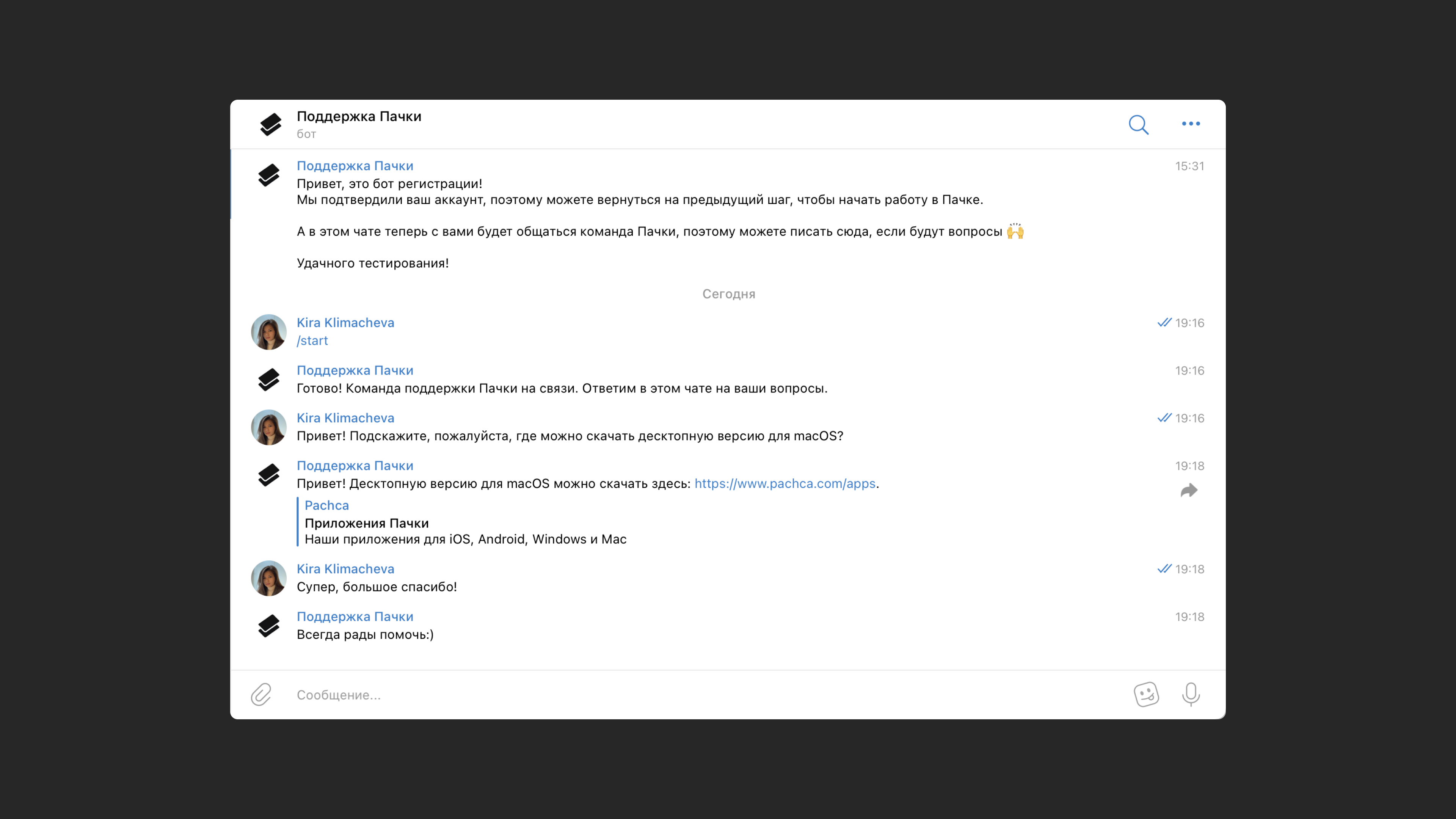 Для быстрого знакомства с Пачкой можно посмотреть демонстрацию (3 мин.), в которой показаны все основные возможности мессенджера или почитать другие статьи в нашей базе знаний.