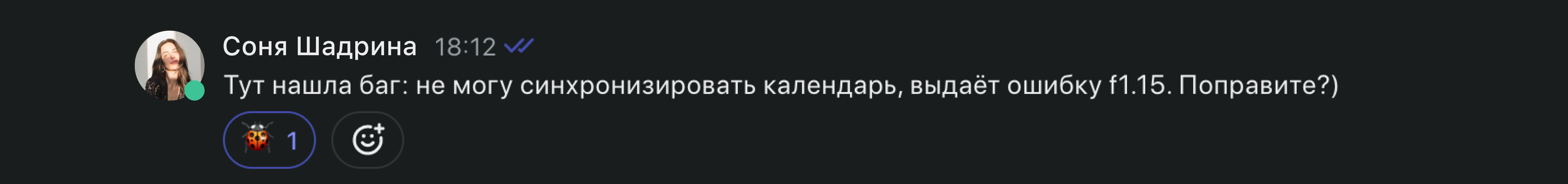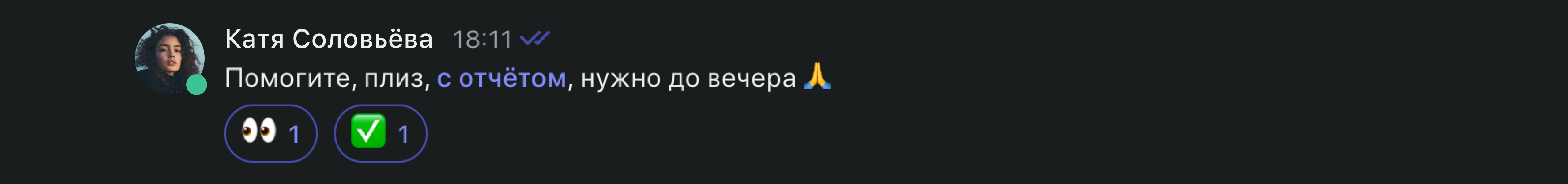 Можно попросить коллег помочь в общем чате. Тот, кто захочет вам помочь, сначала ставит к сообщению 👀 («посмотрю»), а потом ✅ («ага, сейчас напишу обратную связь»), чтобы и вам, и другим было видно, откликнулся ли кто-нибудь.