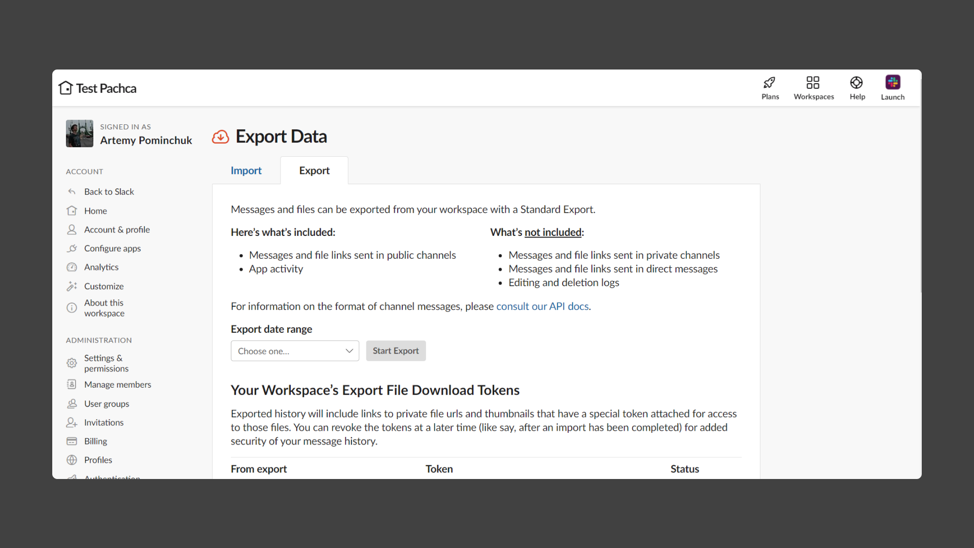 На разных тарифах у Slack разные возможности по выгрузке данных из системы. Все отличие — в типах чатов, которые можно экспортировать. На одних тарифах можно сделать выгрузку только из открытых каналов, на других из открытых, закрытых и личных чатов.
