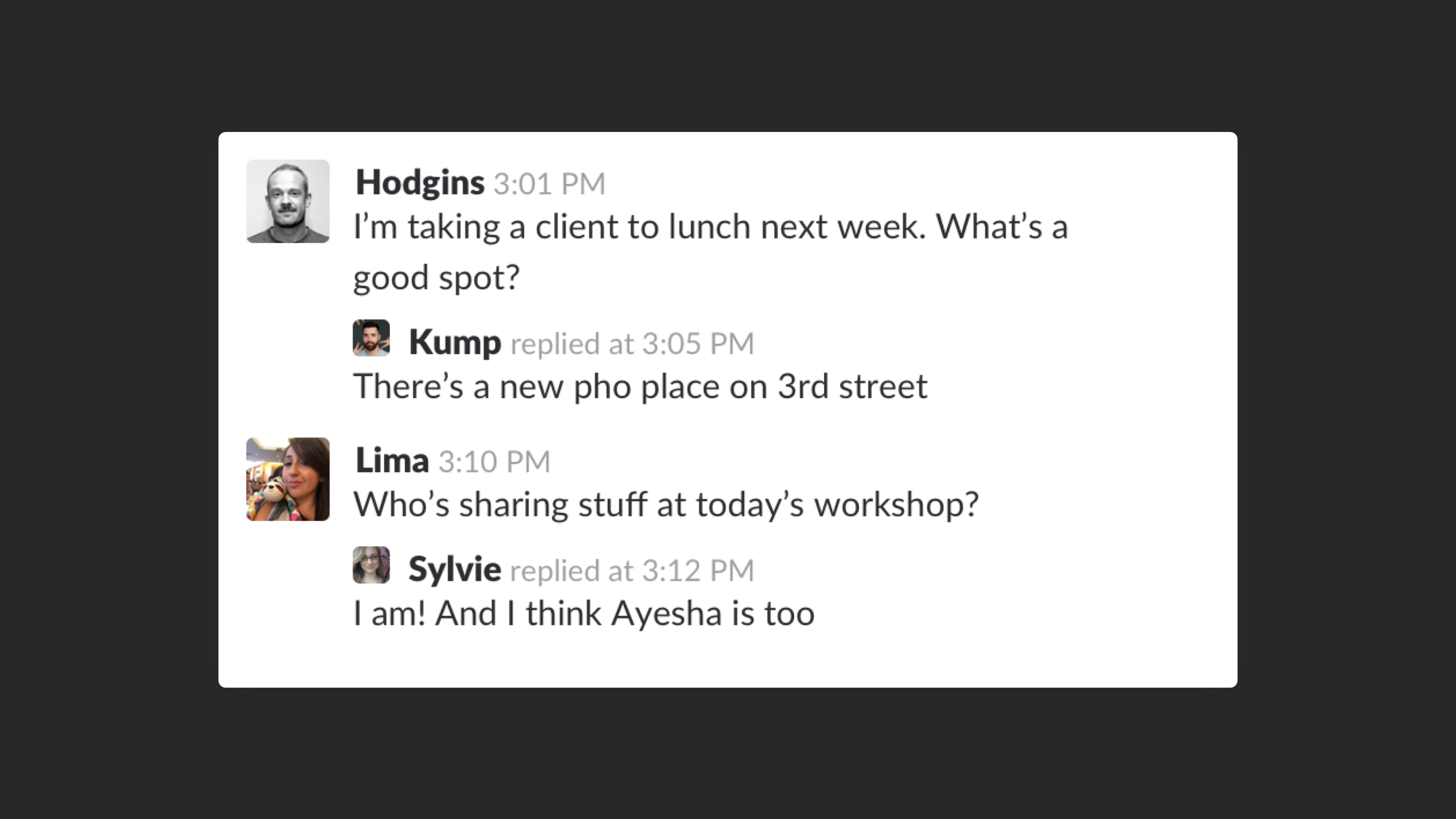 Примечание: Slack переводит “Threads” как обсуждения. Это отражает суть функционала: команда может перекинуться сообщениями и обсудить вопрос (а не просто оставить комментарий)