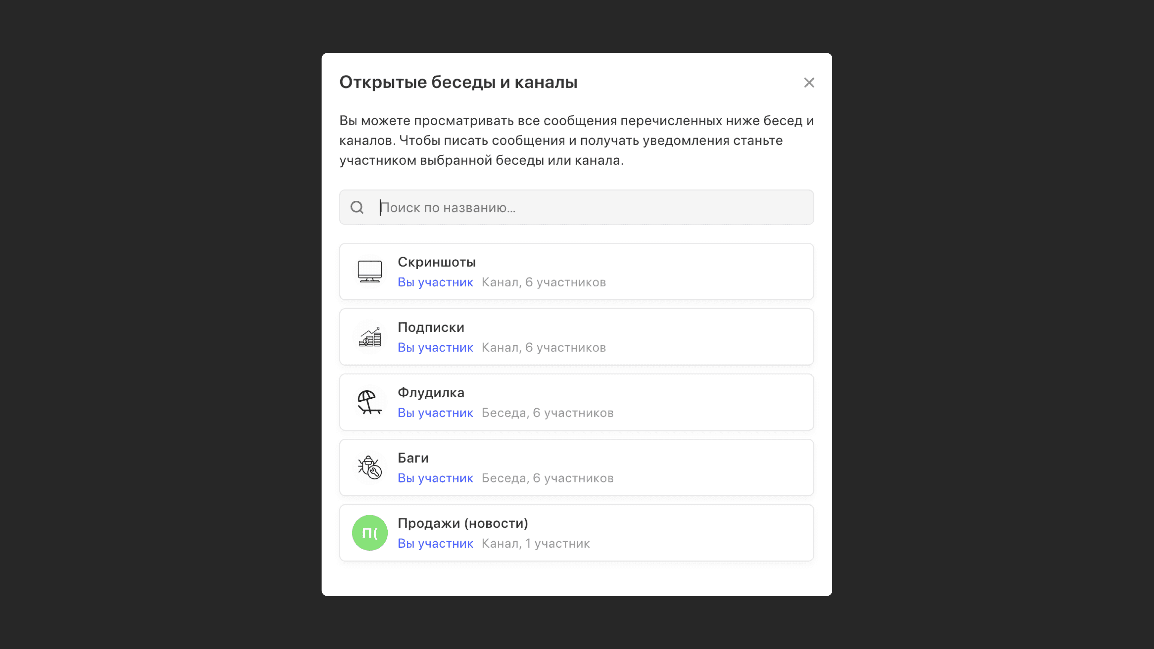В открытые каналы и беседы может зайти любой сотрудник компании, кроме Мульти-гостя и Гостя. Список таких чатов есть в отдельном разделе «Обзор». Вы сможете зайти в любой из таких чатов, не вступая в него — а значит, не будете получать уведомлений, пока сами этого не захотите.