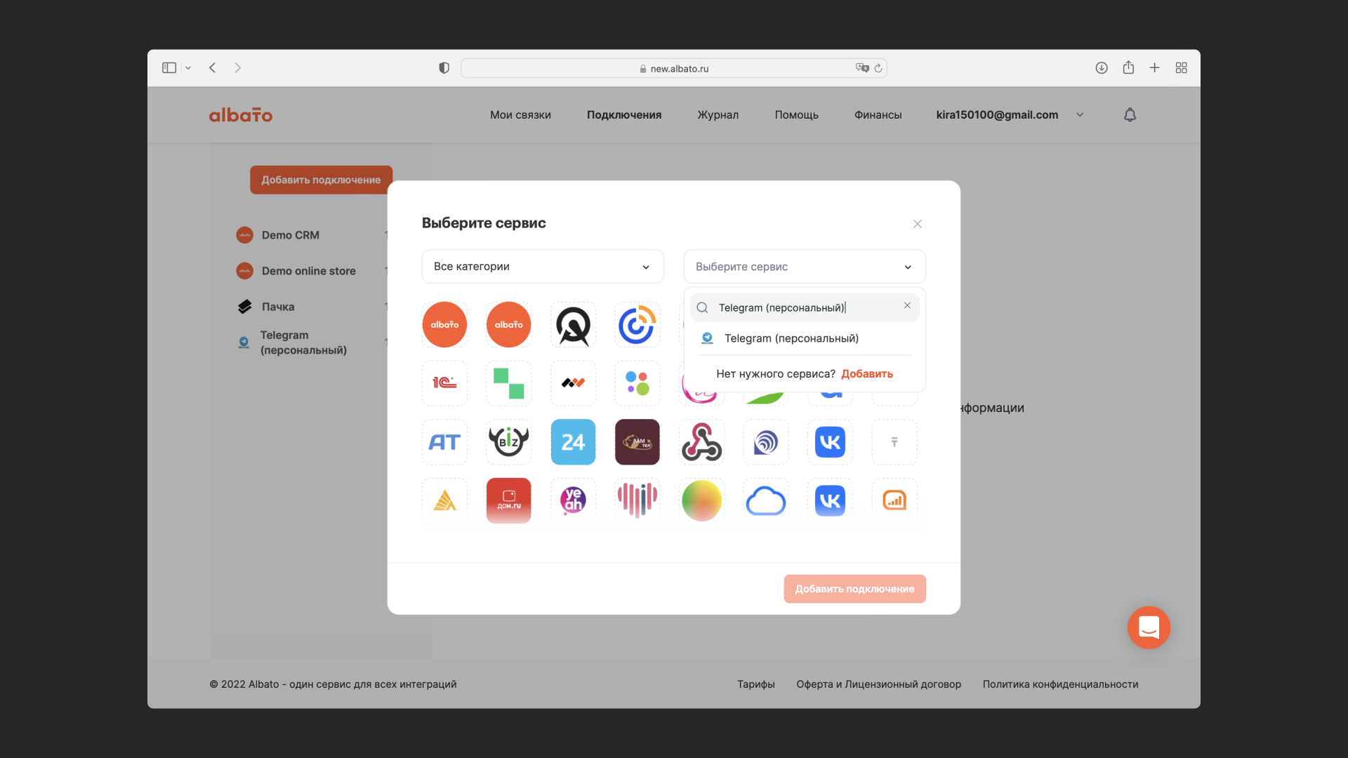 Еще среди сервисов, доступных для подключения, можно найти МойСклад, CloudPayments, YClients и др. Полный список можно посмотреть при создании связки в личном кабинете Альбато (об этом ниже).