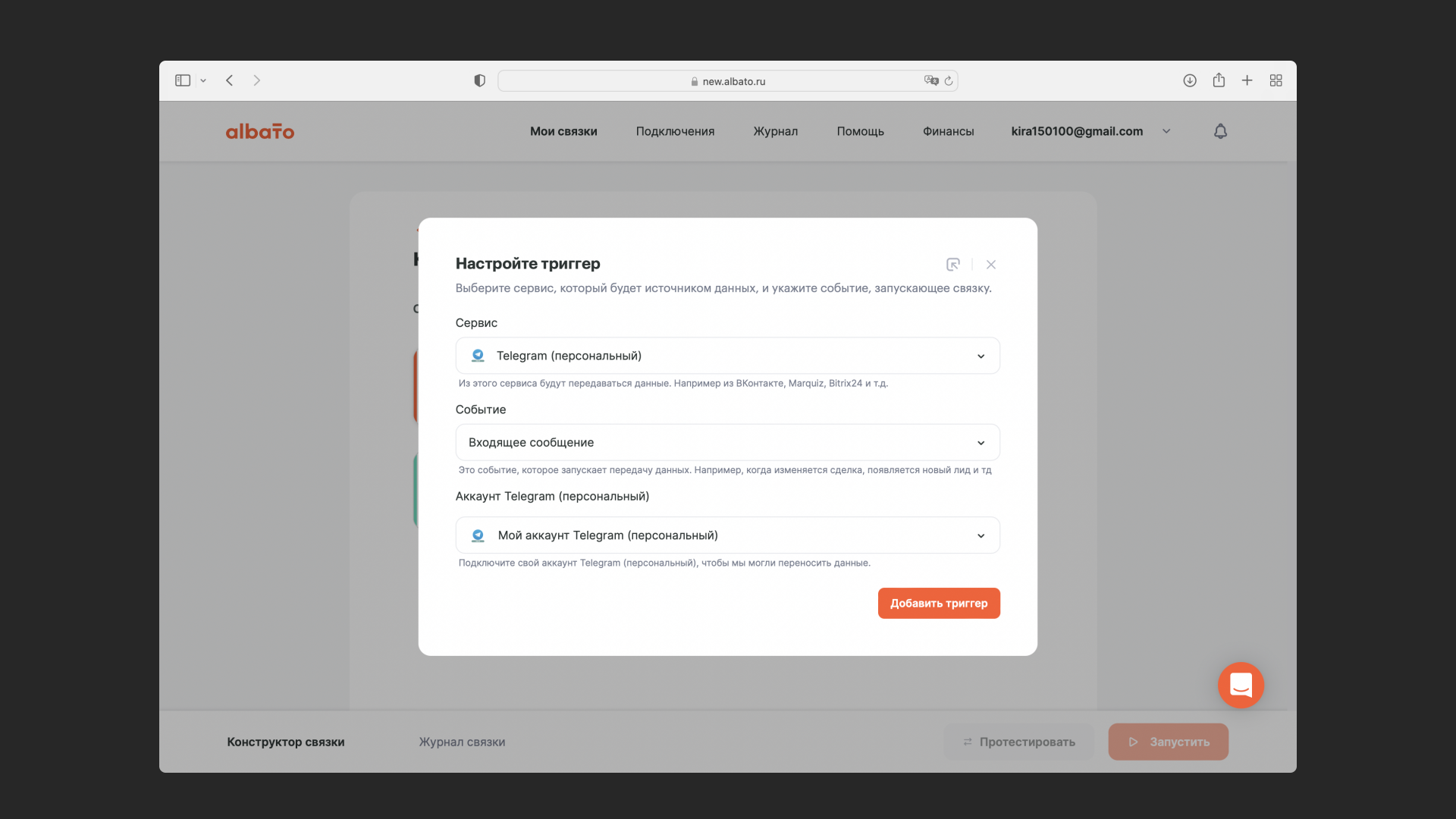 Примечание: В Albato можно добавлять условия для прерывания или продолжения работы связки (то, в каких случаях данные будут передаваться, а в каких — нет). Это можно сделать через фильтр входящих данных, который находится внутри кнопки с триггером. Подробнее о нем — в статье Albato.