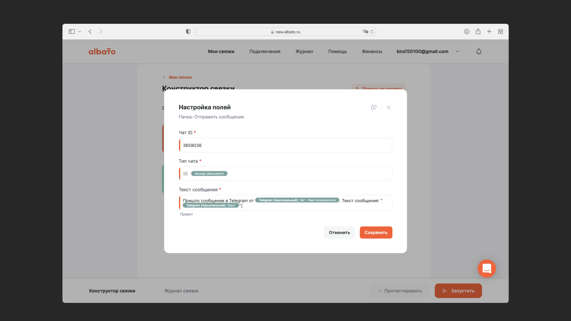 Albato — это платформа, которая помогает интегрировать между собой разные программы (CRM, системы аналитики, мессенджеры и т.д.). Через Albato к Пачке можно подключить более 250 сервисов и получать уведомления прямо в чаты и каналы Пачки.