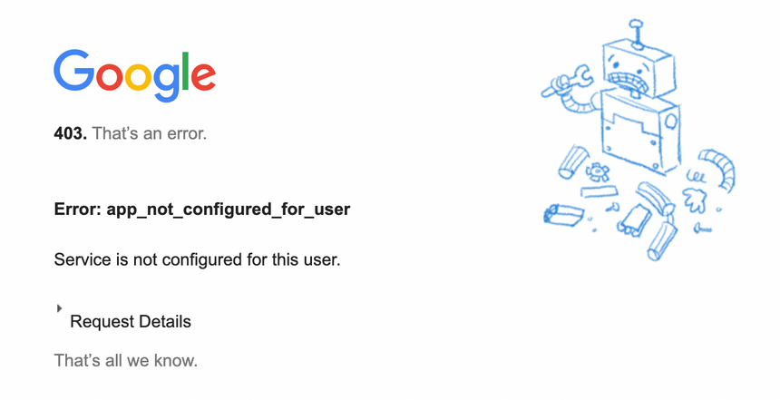 Если при входе вы получаете ошибку «app_not_configured_for_user», это означает, что вы выполняете вход с аккаунта главного администратора. Попробуйте зайти с другого аккаунта.