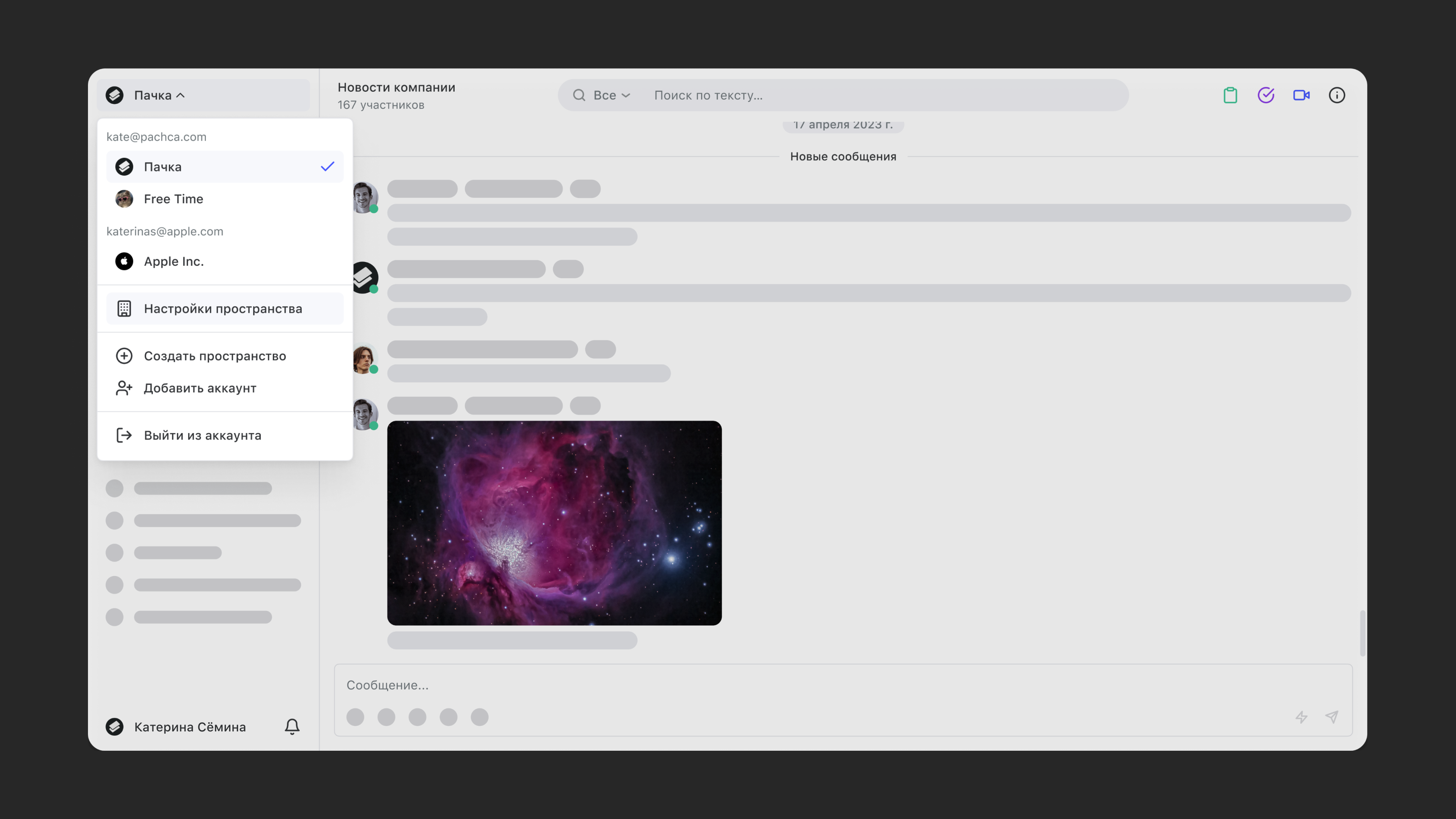 Чтобы добавить себе новое пространство или управлять текущим, нажмите на название компании в левом верхнем углу экрана — появится выпадающее меню с различными действиями. В настройках пространства, например, можно установить ваш логотип, который будет отображаться у всех пользователей Пачки.