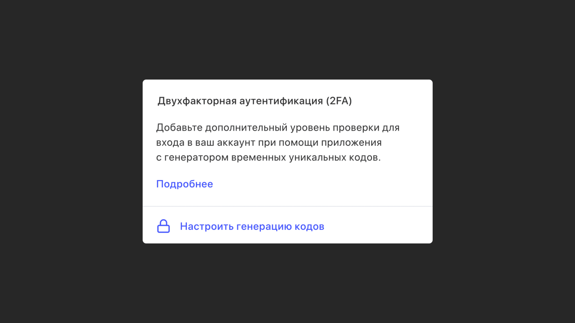 Безопасность вашего аккаунта = безопасность всей команды. Чтобы никто, кроме вас, не смог зайти в аккаунт, настройте двухфакторную аутентификацию. В профиле перейдите на вкладку «Аккаунт» и нажмите «Настроить генерацию кодов».