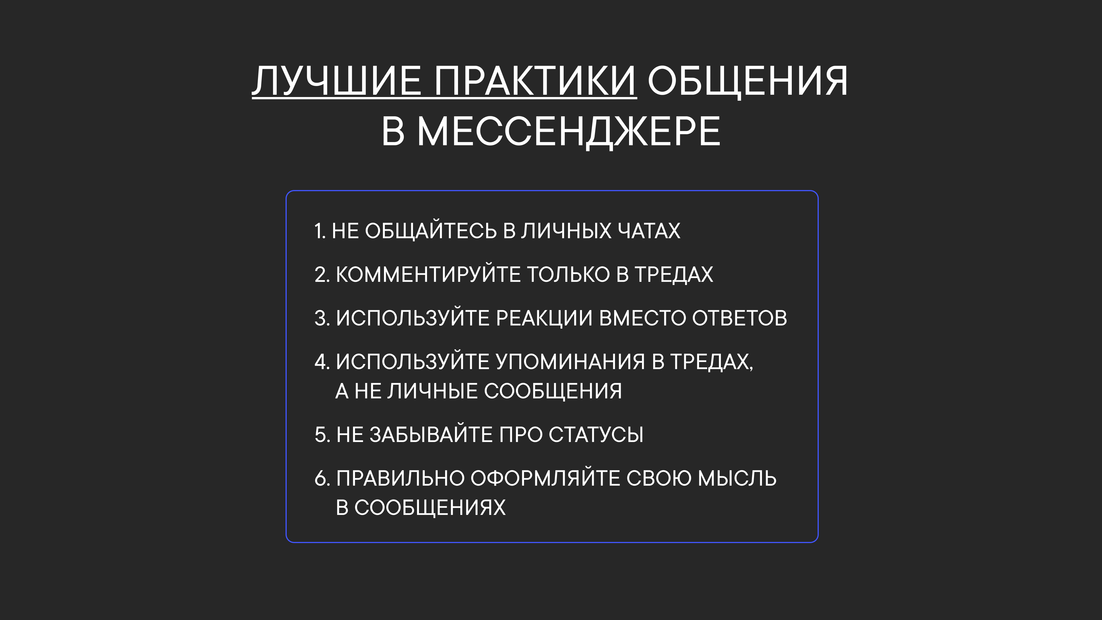 Есть много советов о том, как правильно общаться с коллегами в чатах. Основываясь на опыте общения в разных мессенджерах, мы собрали лучшие практики, которые помогут вам эффективнее решать рабочие задачи в Пачке.