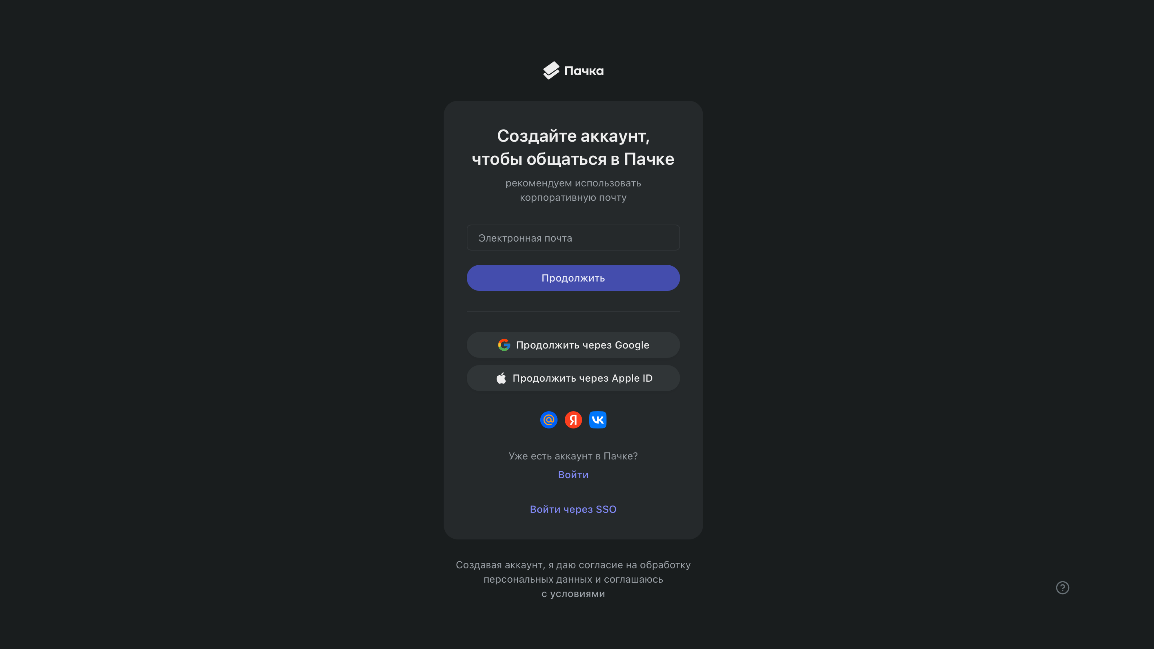 В Пачке есть несколько способов регистрации и входа. В этой статье рассмотрим все возможные сценарии.