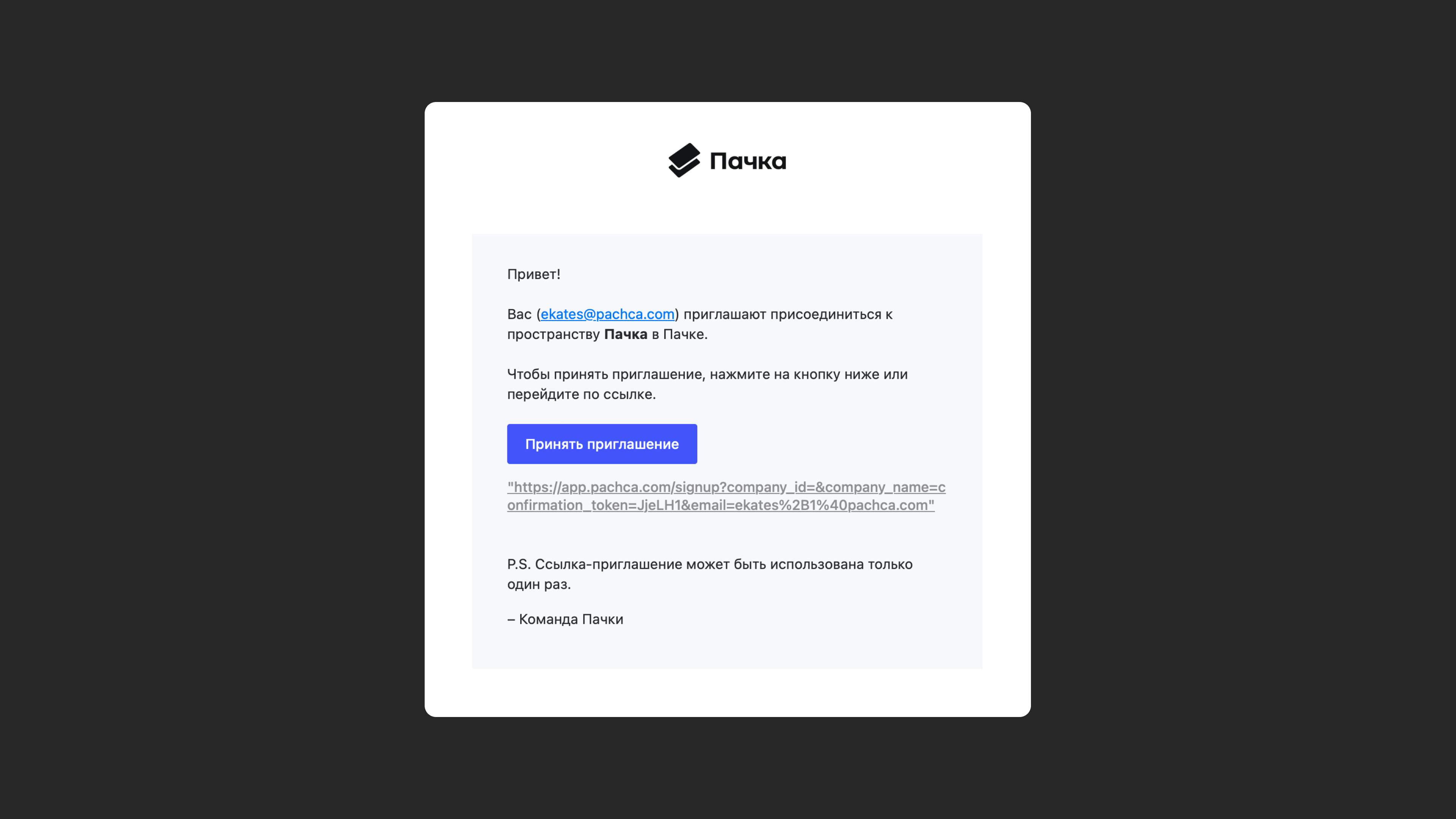 Если вы хотите присоединиться к уже созданному пространству вашей компании, вам не нужно регистрироваться самим на сайте Пачки. Есть два способа присоединиться к вашей компании в Пачке: